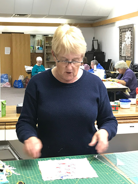 Sandra D. was kept busy quilting baby quilts. She was using a walking foot and straight line quilting. When making diagonal lines in both directions it gives an attractive on point square pattern. I believe she was able to complete three quilts!